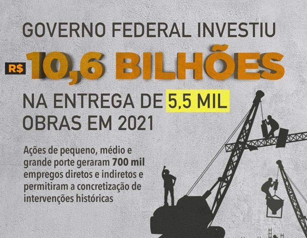 O Governo Federal finaliza 2021 com 5,5 mil obras e projetos entregues à população em todos os regiões do país. São ações de pequeno, médio e grande porte que receberam R$ 10,6 BILHÕES em investimentos, incluindo Orçamento Geral da União e financiamentos.