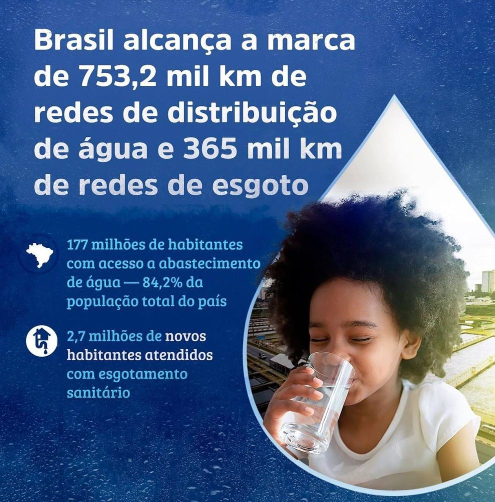 Dados dos Diagnósticos Temáticos do Sistema Nacional de Informações sobre Saneamento 2022 apontam crescimento na segurança hídrica no Brasil. Mais brasileiros têm acesso a água e esgoto, com 753,2 mil km de redes de distribuição de água e 365 mil km de redes de esgoto no país.