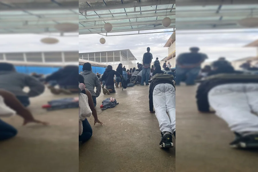 As imagens mostram estudantes sendo submetidos às punições em uma área da escola, que integra o modelo cívico-militar. Segundo a denúncia, a medida teria sido aplicada porque alguns alunos usavam casacos em cores consideradas inadequadas pela unidade de ensino.