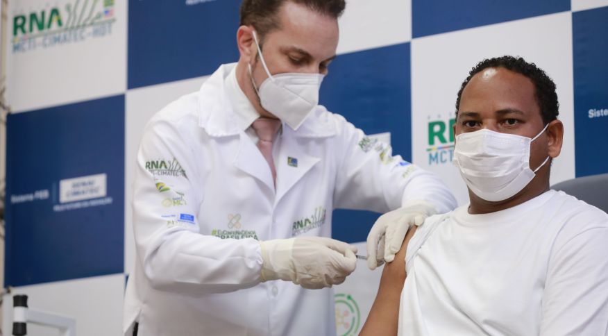 A primeira dose da vacina brasileira contra a Covid-19, nomeada tecnicamente como RNA MCTI CIMATEC HDT, foi aplicada em um voluntário no país nesta quinta-feira (13).
