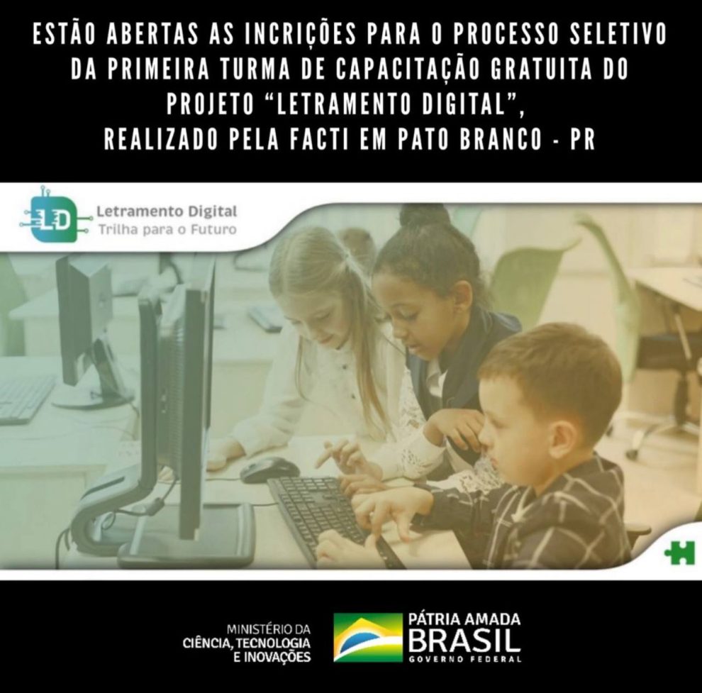 Chegou à cidade de Pato Branco! Com foco na experiência do aluno, a iniciativa promoverá inicialmente a capacitação gratuita em competências técnicas e comportamentais para a formação de multiplicadores do conhecimento, nos temas mais demandados pelo mercado atual e de tendências tecnológicas para o futuro. As inscrições para o processo seletivo estarão abertas até o dia 11/12/22, com 120 vagas disponíveis, para a primeira turma do Projeto Letramento Digital – Etapa CLATP (Cursos Livres de Aplicação Técnica e Profissionalizante), destinada aos Professores da rede pública, Estudantes de Ensino Médio, Técnico ou Superior e Profissionais de TIC, que residem, estudam ou trabalham na cidade de Pato Branco – PR. As inscrições são realizadas pelo site letramentodigital.org.br