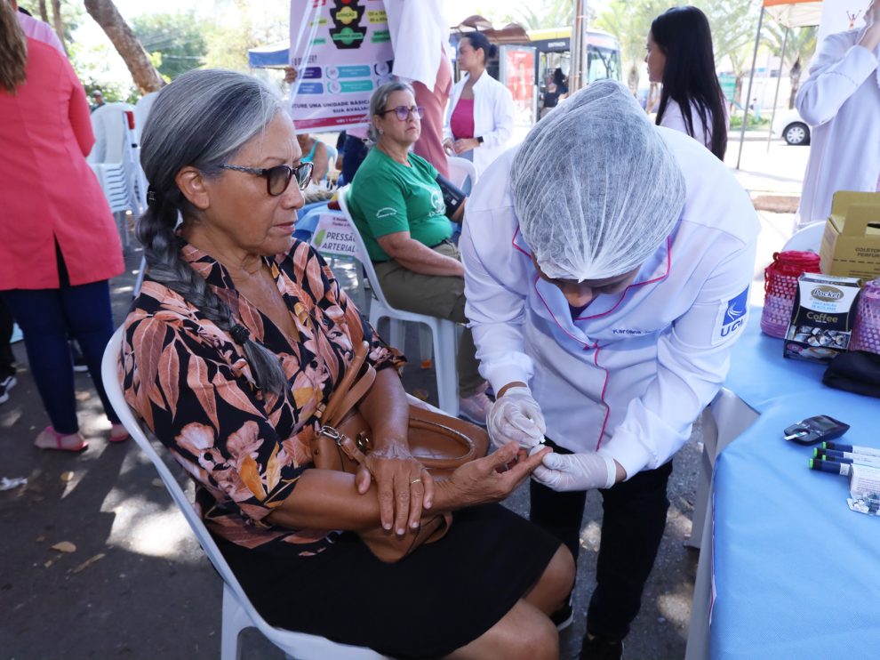 Geni Rosa Santos, 73 anos, é exemplo de superação e cuidado com a saúde. Há 11 anos, ela enfrentou um câncer de útero, precisou passar por cirurgia para a retirada do órgão e, hoje, curada, celebra a vida ao lado dos filhos e netos. Moradora da Candangolândia, Geni é frequentadora assídua da UBS 1, participando regularmente dos eventos e acompanhando de perto sua saúde. “Vou ficar o dia todo aqui para aproveitar todos os serviços que estão sendo oferecidos. Fiquei sabendo do evento por vários grupos. A gente precisa se cuidar, né?”, afirmou enquanto esperava para aferir a glicemia.